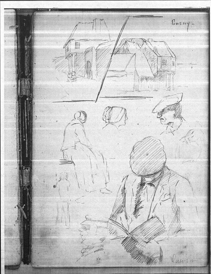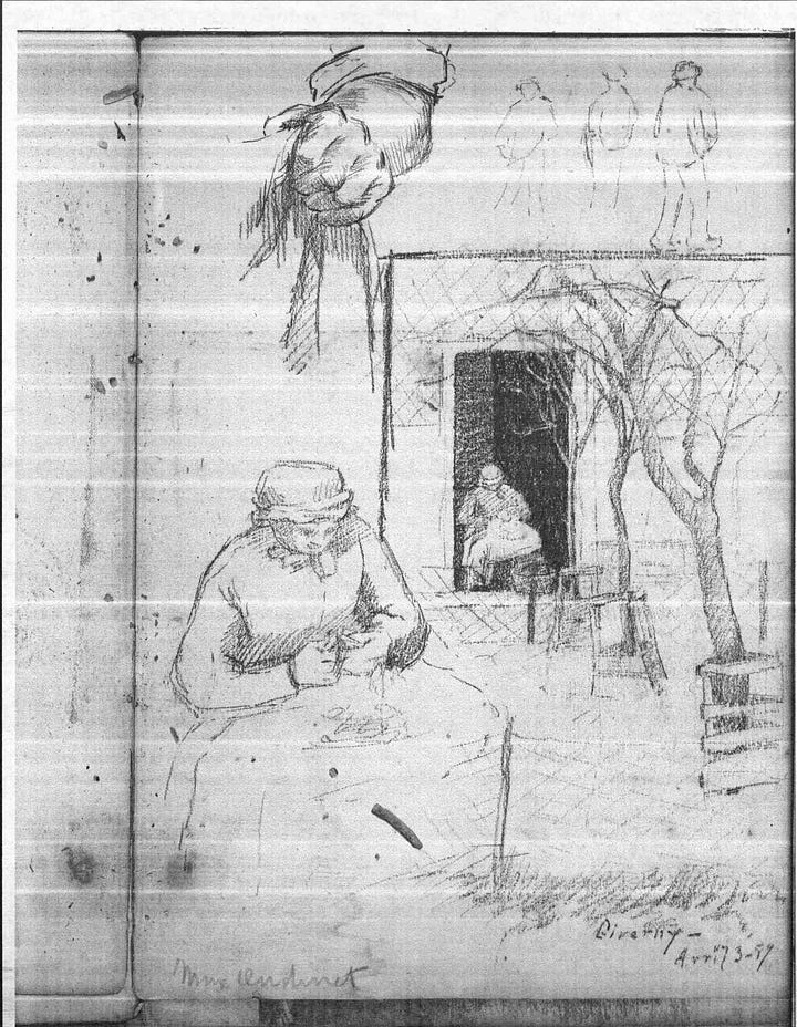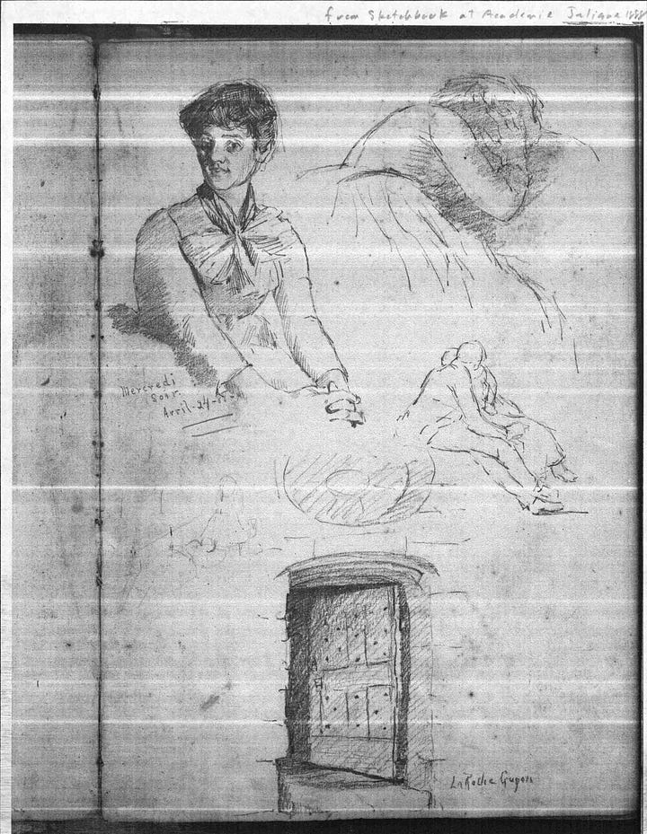 Whether or not the first, Cherry was certainly one of the earliest woman artists to visit the fledgling art colony, and she painted at least half a dozen paintings and filled pages and pages of her sketchbooks during her two visit there, in October 1888 and early spring 1889. She took the short train trip from Paris to visit her childhood friend, and traveling companion, Mary Hoyt Sellar (1864-1952), and Mary’s new husband, the English (later Texas) painter, Dawson Dawson-Watson (1864-1939).