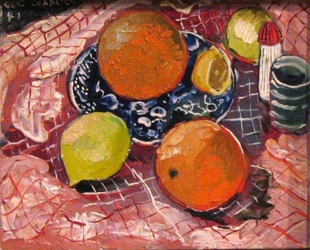 Charlton Roses, Oranges and Egplant c.1942 oil on canvas 17th Annual Houston Artists Exhibition, museum purchase prize, 1942. Museum of Fine Arts, Houston, permanent collection.