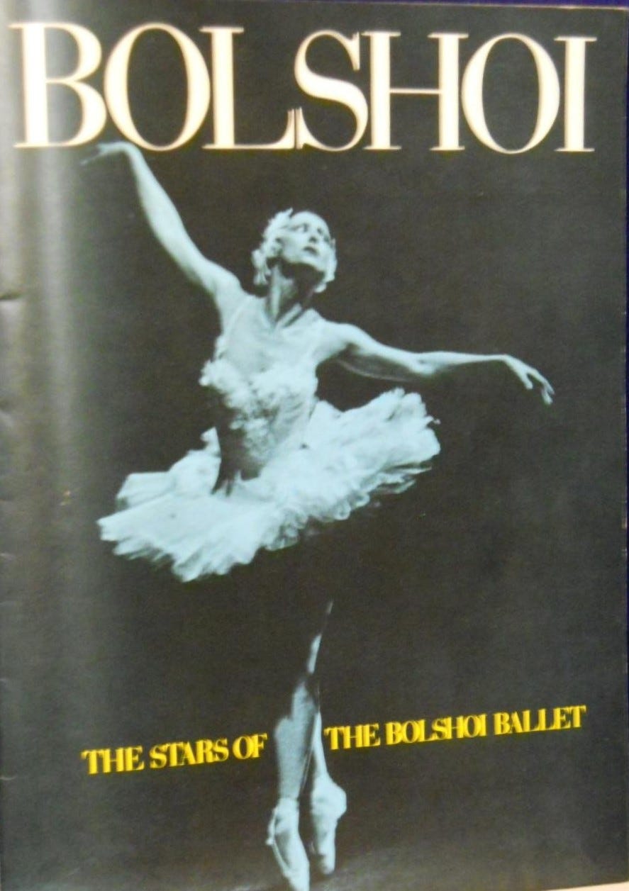 But the moment that changed my life, the one I’ll never forget, happened as The Dying Swan (a.k.a. Maya Plisetskaya) floated onto the stage to the haunting strains of Saint-Saëns, embodying said swan, choreographed to sublimity, by Fokine. OMG, those arms! There could not possibly have been bones in them. Or, if there were, they were the celestial bones of real swan’s wings, not the gross, clumsy ones of us land-bound humans. (If you’ve never seen her dance it, do your self a favor and watch the YouTube link.)