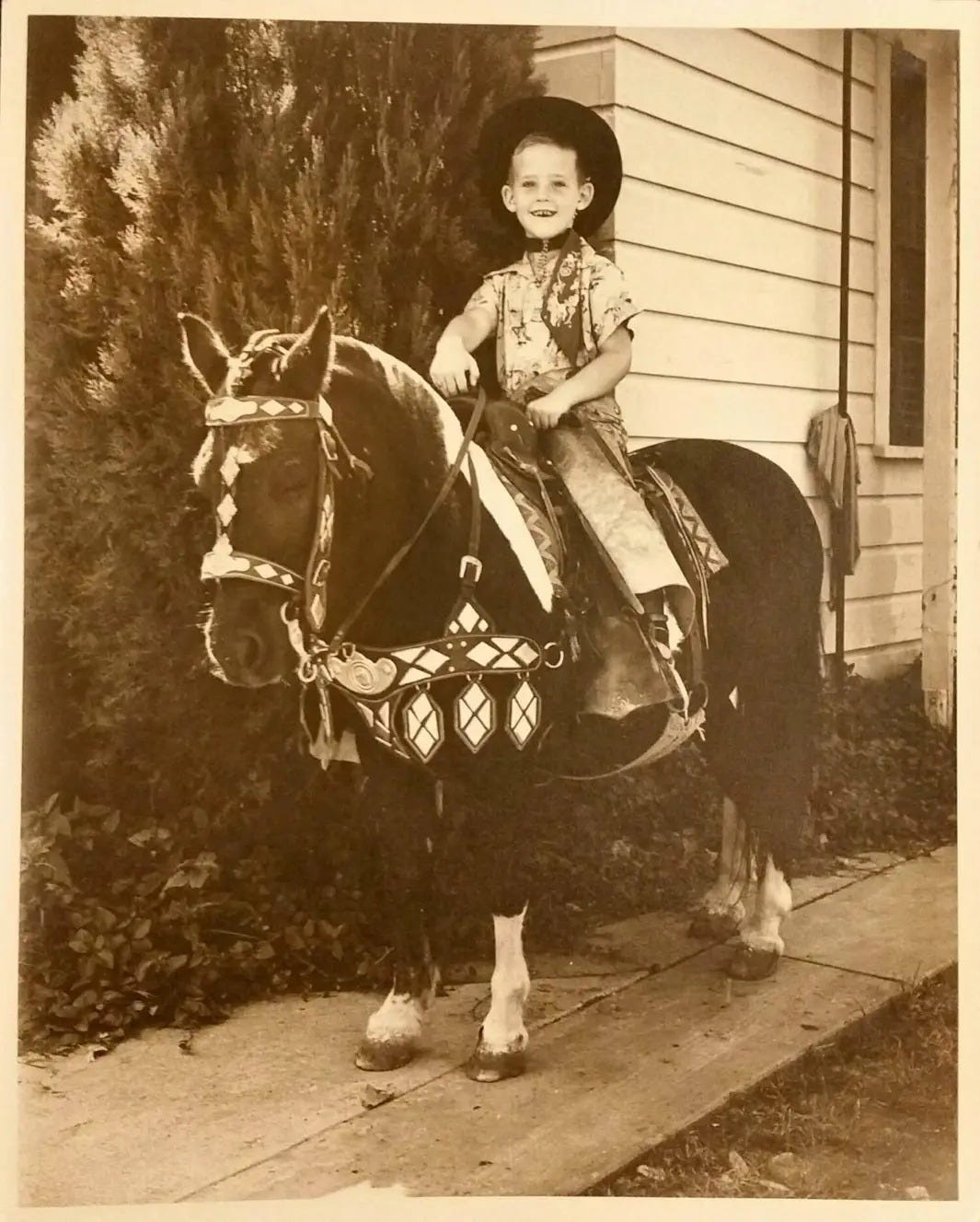 Why ballet, but never opera, I’ve wondered? Neither was a feature of the West Texas where I grew up in the ‘50s. So one would be as unlikely as the other. Perhaps my early career in dance had some bearing. I had been, after all, a child dance star in a minor universe. I’d even tapped on television as a child of six – for Cowboy Bob (or am I making that name up out of memory muddle?), wearing hat and boots, and chaps and glittering cowboy vest over my little-boy Texas cowboy togs – and turquoise and silver string tie, of course (or, at least, turquoise-like and sort-of silver). An outfit much like this one, but without the horse. Though to be real about it, the horse might have done a better job with the steps than I - and he wore his tap shoes all the time.