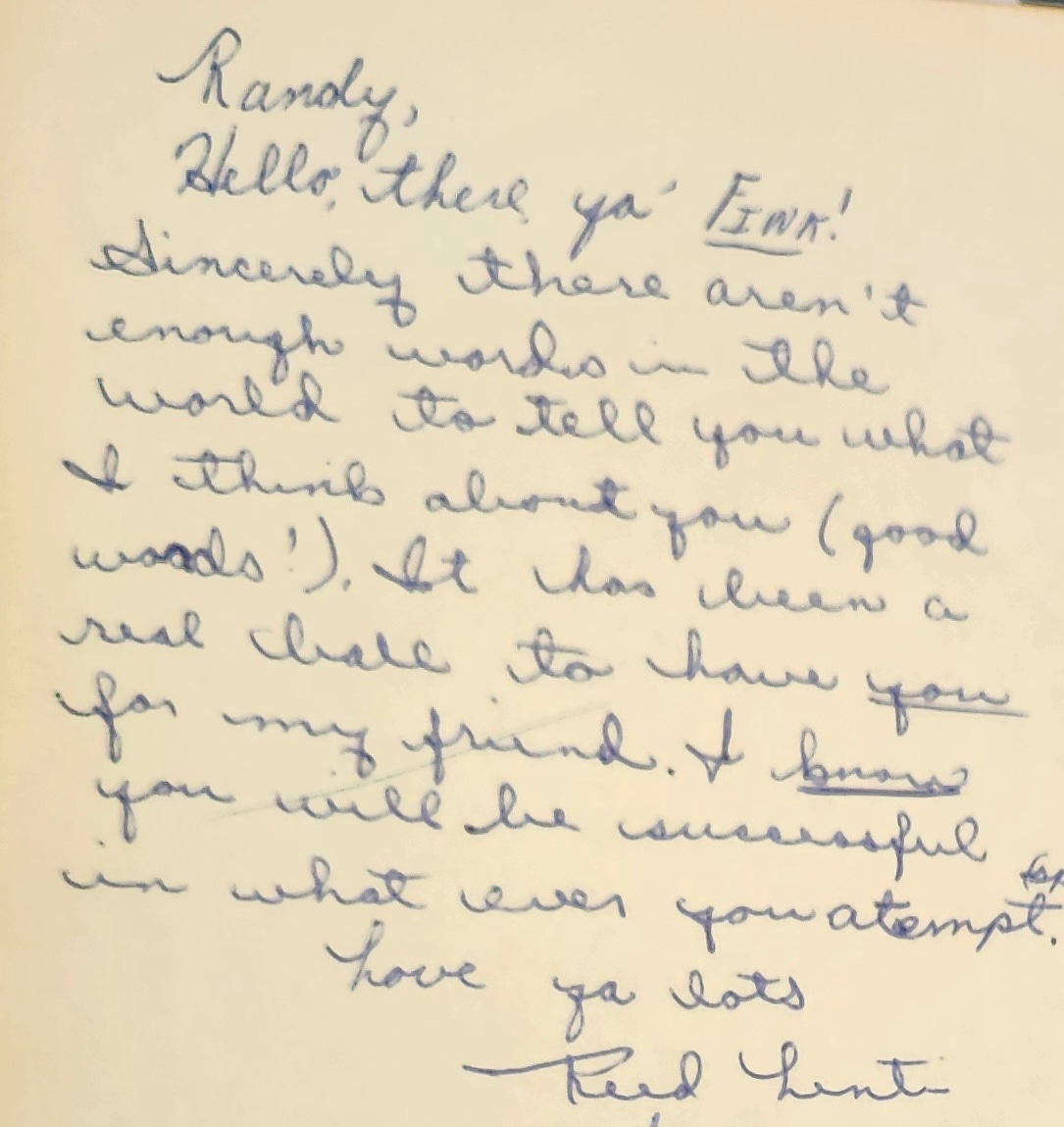 “Randy, Hello, there ya’ FINK! Sincerely there aren’t enough words in the world to tell you what I think about you (good words!). It has been a real ball to have you for my friend. Love ya lots, Reed.”