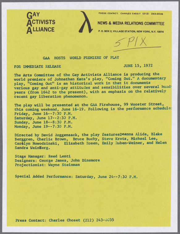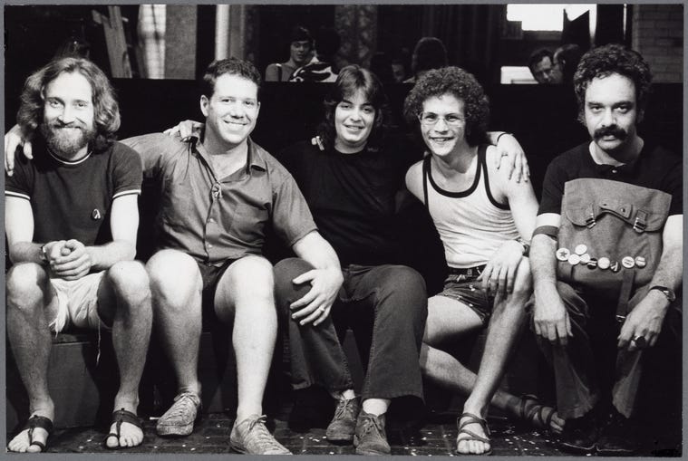 My search for Reed did not produce such happy finds. I did learn that he made good on his drama dreams, and in New York! Though in a supporting way. He was never the star himself, but theatRE isn’t only STARS. It needs STAGE MANAGERS too, a role he took on in a truly groundbreaking production of Coming Out! A Documentary Play About Gay Life and Liberation in the USA, produced by the Gay Activists Alliance in 1972. How happy Reed looks, how happy they all look, in the crew photo, and how clearly among other boys like him, at last, their arms around each other as they work together to make gay history. Looking at the photo now, I’m happy for Reed, that he found his arms-around brothers – but a bit sad for the two of us, that he and I were never able to acknowledge such a closeness, together.