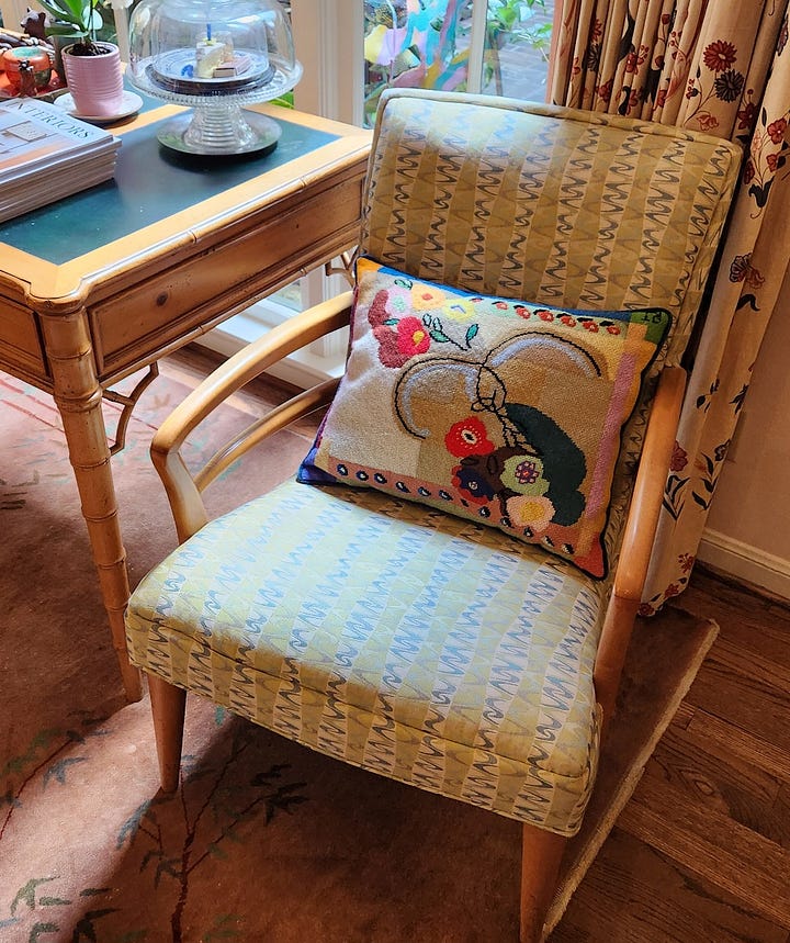 And it didn’t stop there. Another photo, this one of the Charleston sitting room, included a tapestry cushion I found irresistible, tucked into an easy chair, obviously often sat in, perfect for cozy afternoons reading Virginia’s novels, or maybe those of E.M. Forster, a sometimes Charleston visitor. Forster’s Howard’s End lay miles away in Hertfordshire in his novel, but only inches distant in spirit.