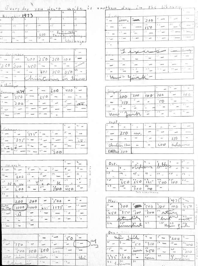 Recently I came across a card I made in 1973 – yes, 50 years ago – on which I intended to record my daily word count, for discipline (see above). Numbers don’t lie. Looks like 500 words a day was my hoped-for sweet spot then. I didn’t make that number many days. Imagine if I had. That’s 500 words a day, times five days a week (since even the dedicated deserve weekends off), times 52 weeks a year, times 50 years. That’s 6,500,000 words – say, 100 novels – no sweat. Just think what my reputation (and praise) would be today had I kept that going. As the chart reveals, I didn’t; though I did travel a good deal, considering my poverty then, and I was pretty good about taking the weekends off. And, by the way, I also had a day job.